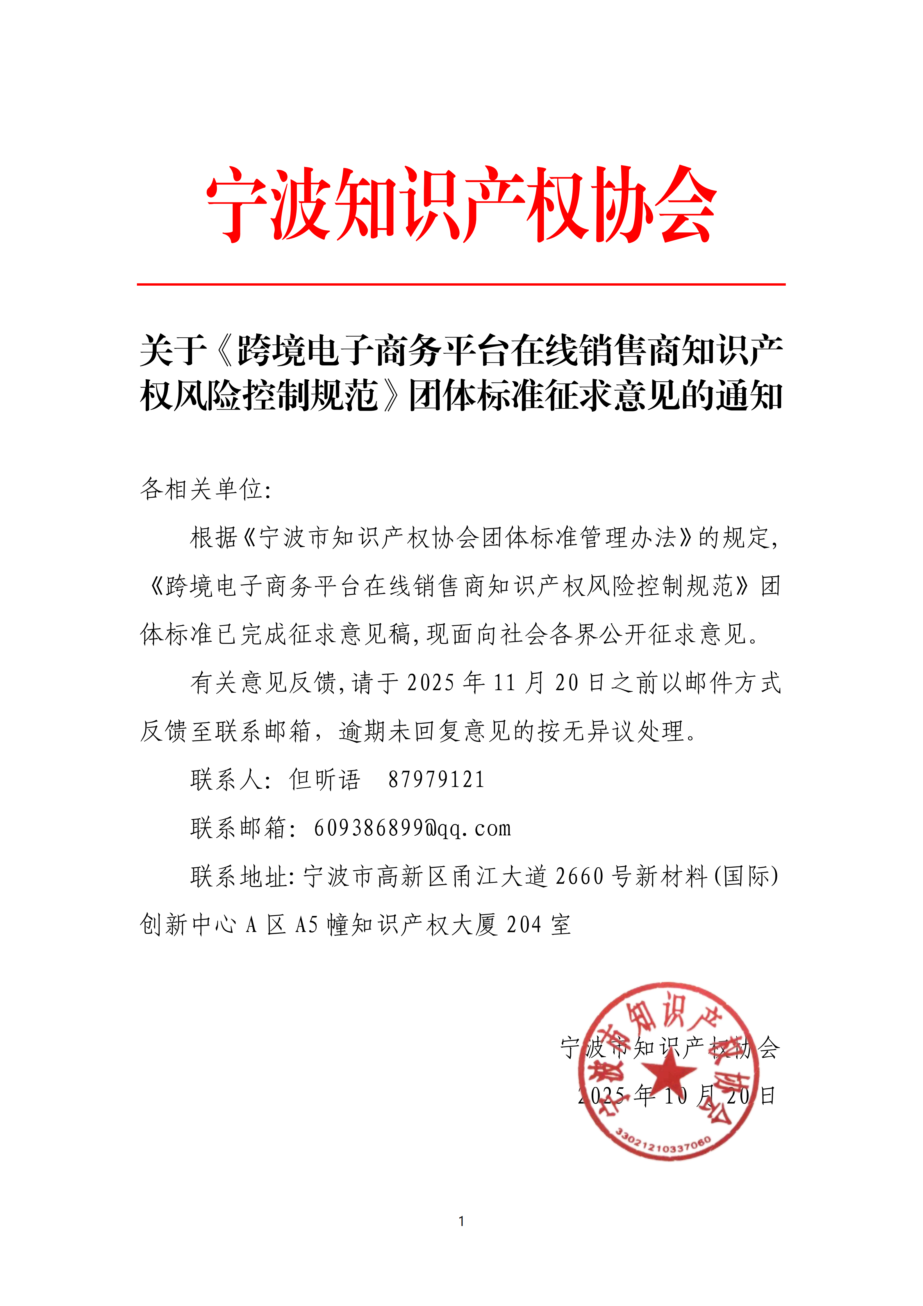 关于《跨境电子商务平台在线销售商知识产权风险控制规范》团体标准征求意见的通知