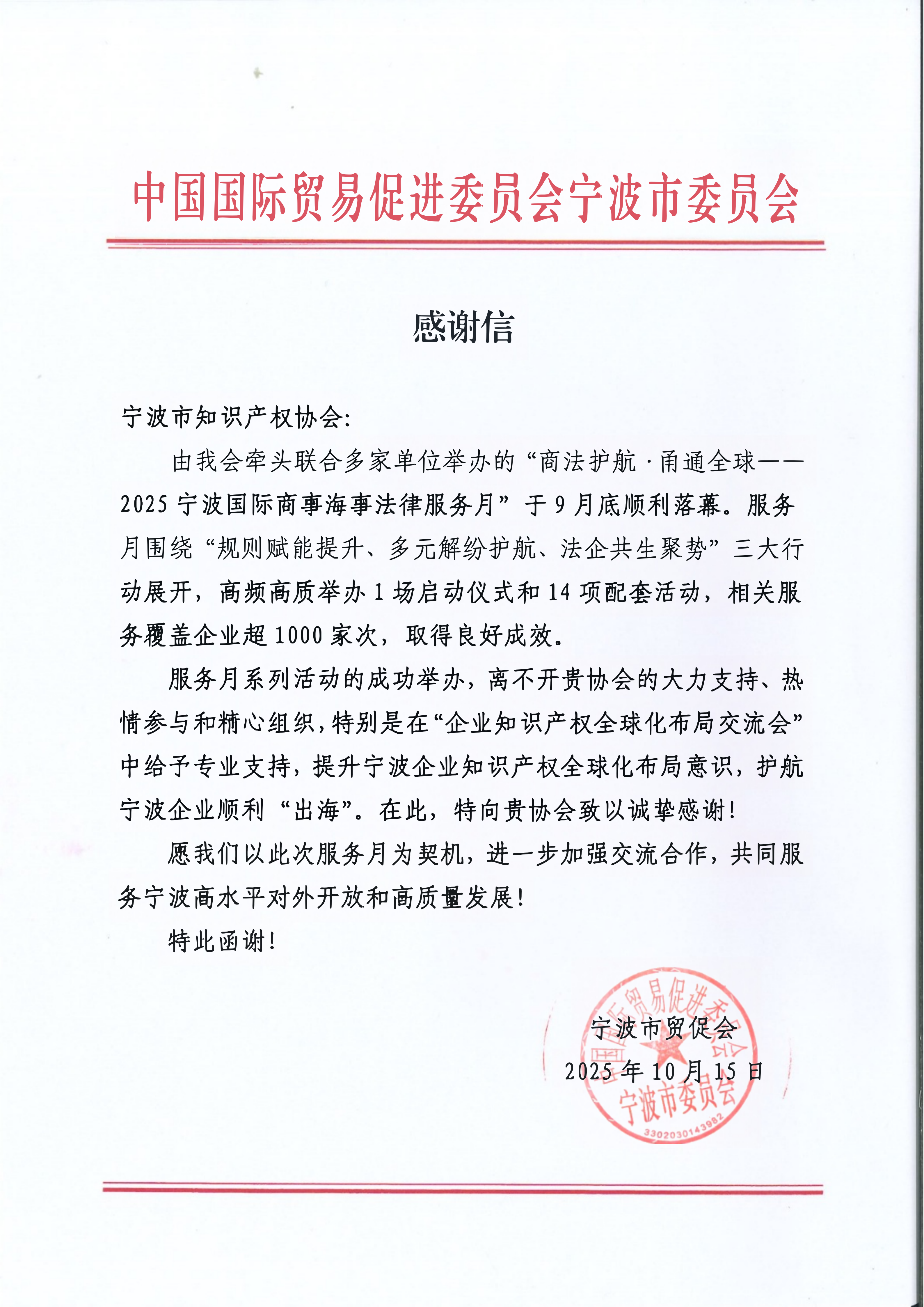 近日,由宁波市贸促会牵头联合多家单位举办的 “商法护航・甬通全球 --2025 宁波国际商事海事法律服务月” 已顺利落下帷幕。活动主办方宁波市贸促会特别提到,服务月系列活动的成功举办,“离不开贵协会的大力支持、热情参与和精心组织”,这一认可既是对协会工作的肯定,也彰显了双方协同服务企业的良好成效。作为本次活动的重要支持单位,宁波市知识产权协会全程深度参与、精心组织,以专业力量为活动赋能,为宁波企业知识产权全球化布局注入强劲动力,获得活动主办方及参与企业的高度认可。