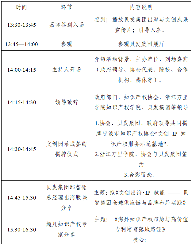 1.正式落成宁波市知识产权协会与贝发集团文创园合作,打造区域文创IP知识产权服务示范基地;浙江万里学院知识产权学院、宁波市知识产权协会、贝发集团签约文创IP知识产权产学研。