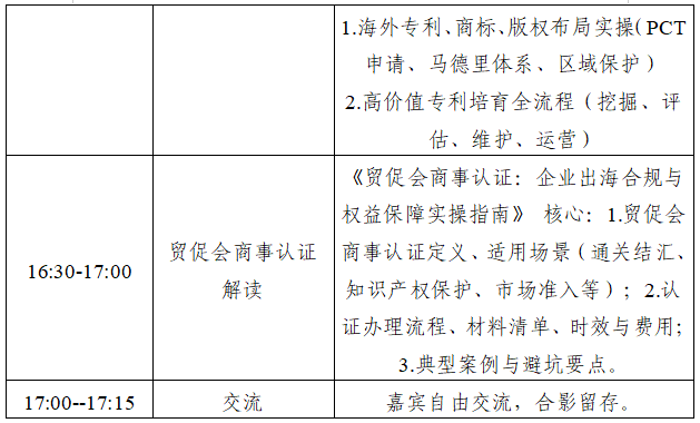 3.明确海外知识产权布局路径,建立高价值专利培育机制,配套贸促会商事认证合规服务,降低出海合规风险。