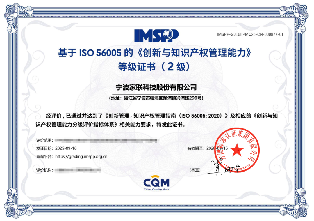 我会会员单位宁波家联科技股份有限公司日前成功通过创新与知识产权管理能力分级评价荣获基于ISO56005国际标准的《创新与知识产权管理能力》等级证书(2级),这也是镇海区获得的首张该类认证证书,标志着企业在创新与知识产权协同管理领域实现关键突破。