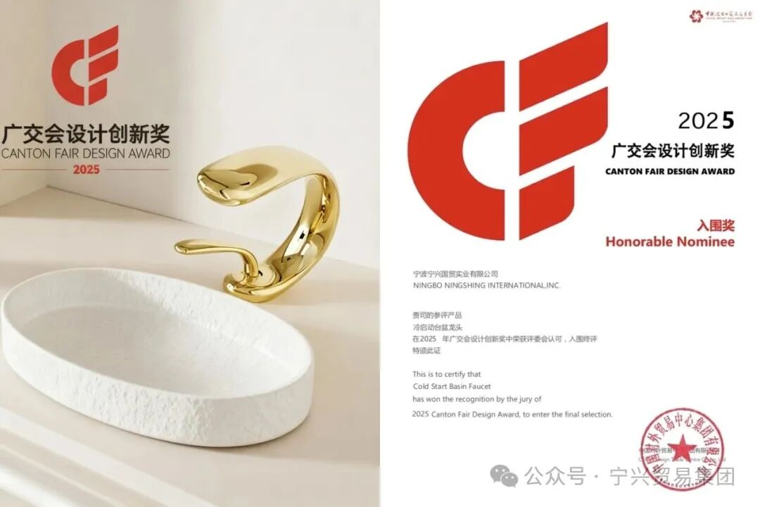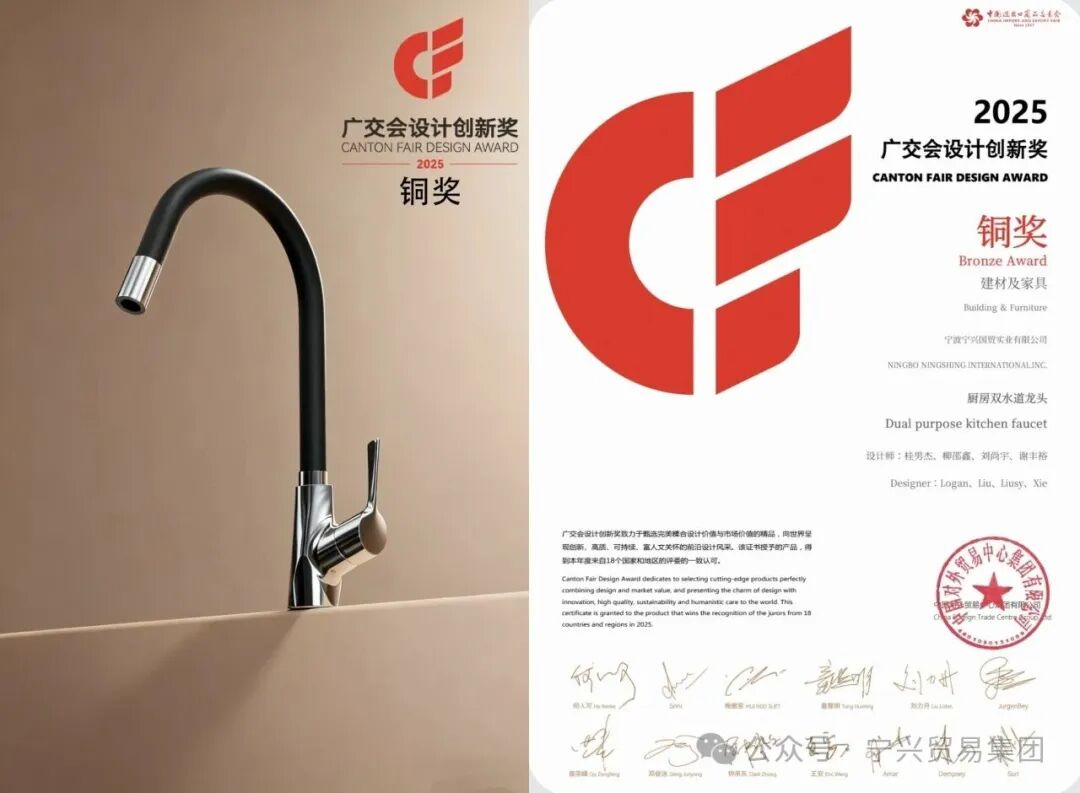 近日,2025年广交会设计创新奖(CF奖)评选结果揭晓,我会副监事长单位宁兴贸易集团旗下的龙头产品成功斩获两项荣誉,其中“厨房双水道龙头”荣获铜奖,“冷启动台盆龙头”获得入围奖。