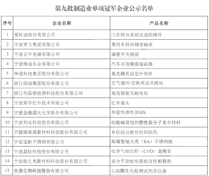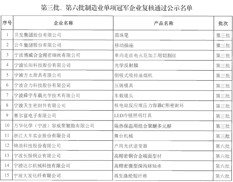 同时,我会共有5家会员企业通过“第三批、第六批制造业单项冠军企业复核”:贝发集团股份有限公司的圆珠笔、公牛集团股份有限公司的移动插座、宁波方太厨具有限公司的侧吸式吸排油烟机、宁波杜亚机电技术有限公司的管状电机、宁波弘讯科技股份有限公司的塑机控制系统。
