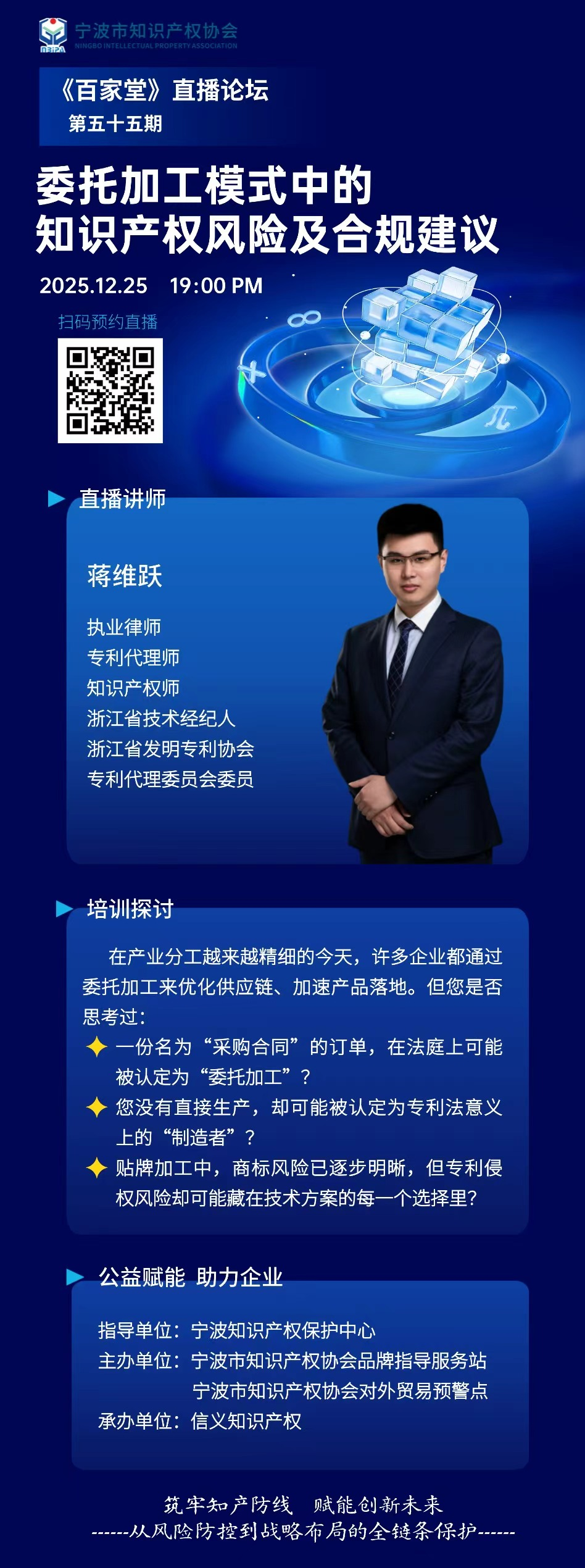 “公益赋能,助力企业”,宁波市知识产权协会《百家堂》线上直播论坛第五十五期12月25日(下周四)晚七点重磅开讲!