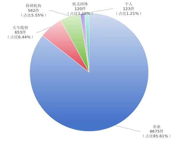 (二)企业创新主导地位稳固,创新主体创新能力梯度明显。2025年1-10月,全市企业、大专院校、科研机构、机关团体和个人发明专利授权量的占比分别为85.61%、6.44%、5.55%、1.18%和1.21%。其中企业授权发明专利8675件,同比下降8.23%。有授权发明专利的企业达2960家,同比下降5.67%。