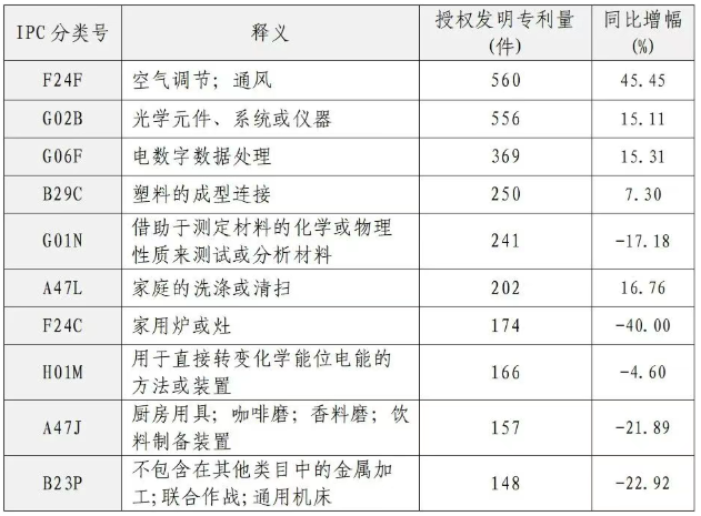 (三)细分领域呈现分化趋势。从发明授权专利IPC分类号看,智能家具在前十IPC分类号中仍占据4个,但不同细分领域呈现不同增长趋势。在空气调节及通风(F24F)领域发明专利授权量560件,同比增长45.45%,高居增速首位;智能家居领域的家庭的洗涤或清扫(A47L)发明专利授权量202件,同比增长16.76%。但在家用炉或灶(F24C)及厨房用具及小家电(A47J)领域,呈下降趋势,分别下降40.00%和21.89%。此外在材料检测(G01N)、金属加工(B23P)和电化学(H01M)领域也呈现不同下降趋势。